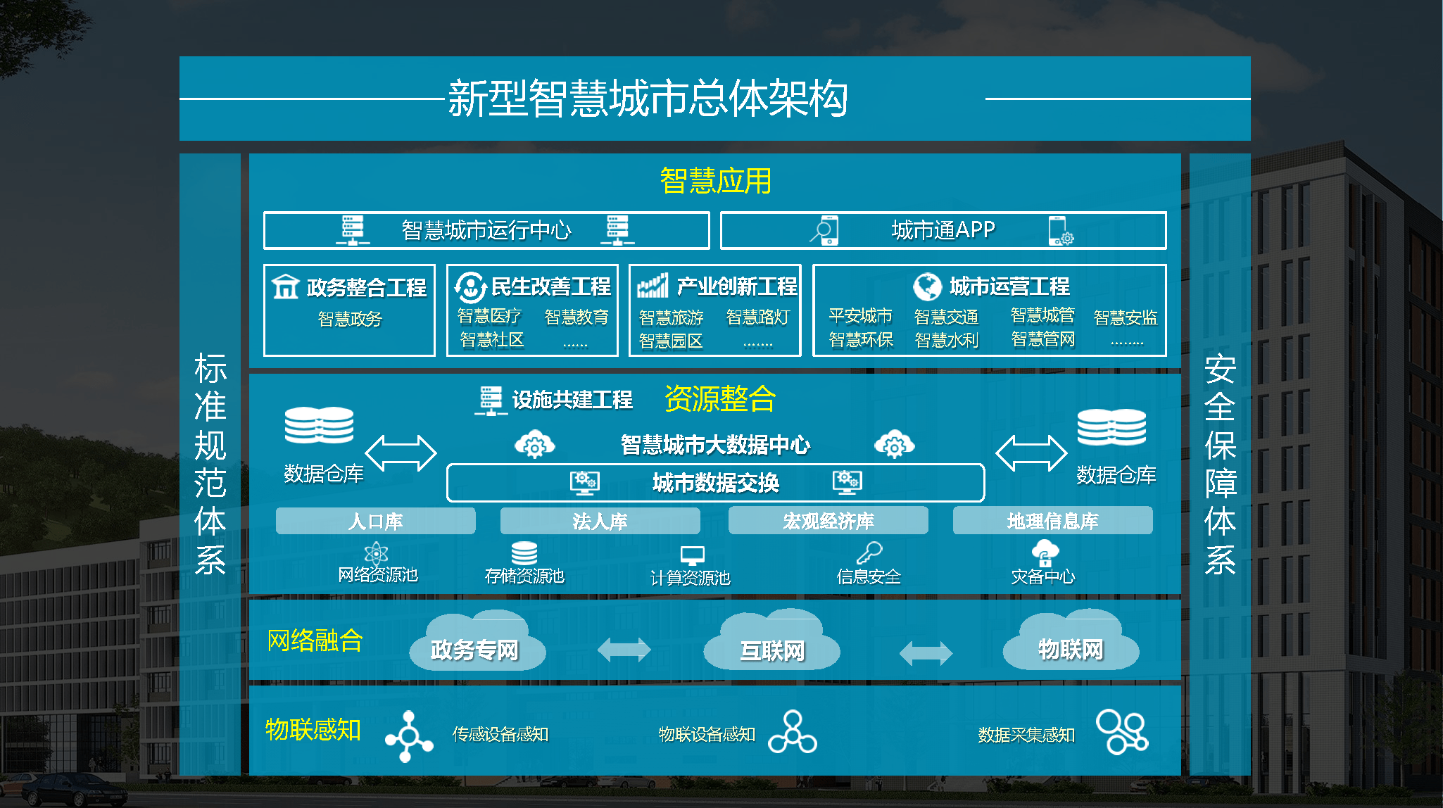 智慧城市的建设目标是充分利用科技创新,以“智慧”引领城市发展,打造环境生态宜居、产业健康发展、政府行政高效、市民生活幸福的城市。在城市信息化基础上,新一代信息技术进一步在城市运行的各个领域全面渗入,形成一个全面感知、广泛互联、相互协同的有机网络。